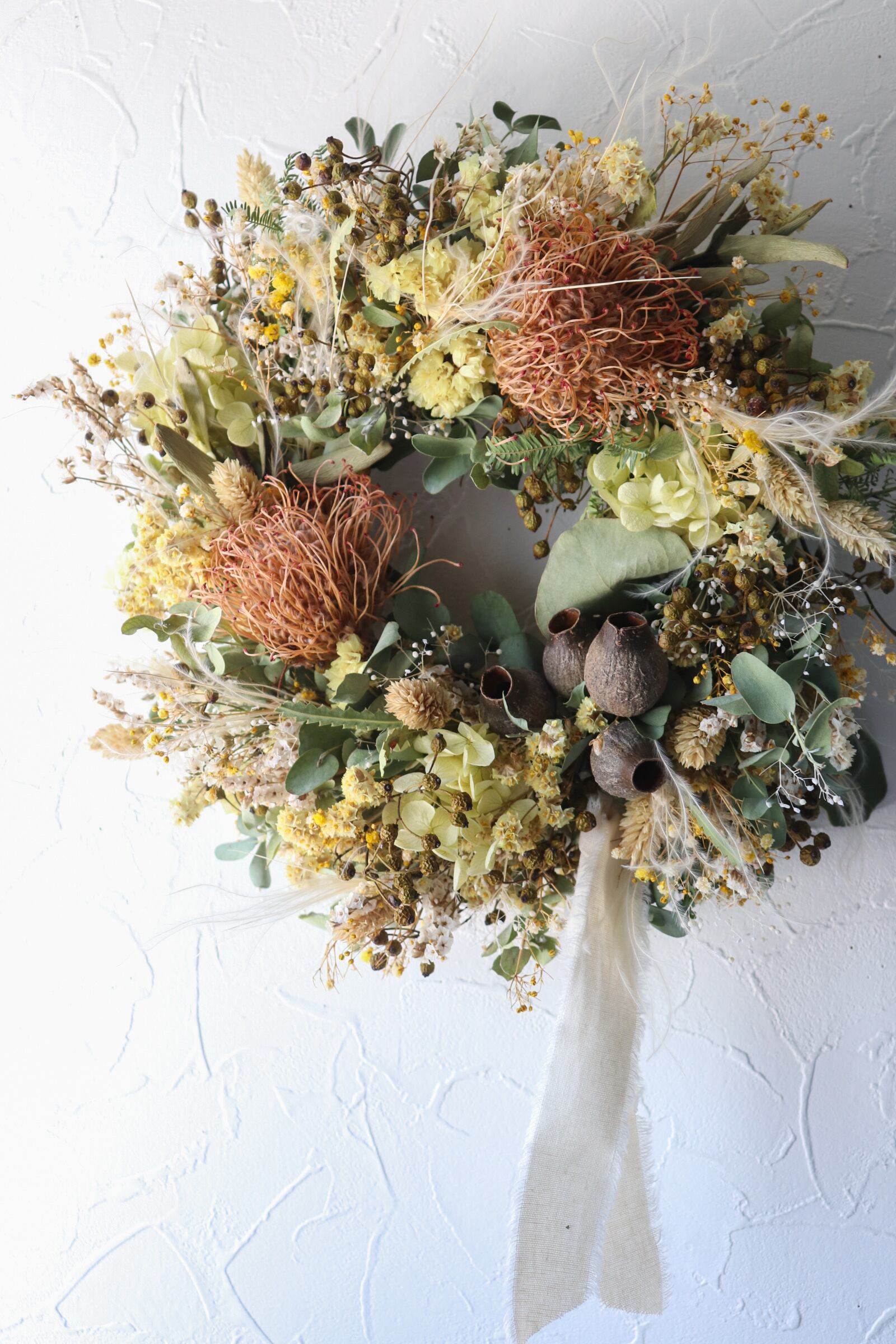 ナッツ、スターチス、紫陽花などを合わせた、黄色とオレンジの秋を感じるアンティークな色合いです。