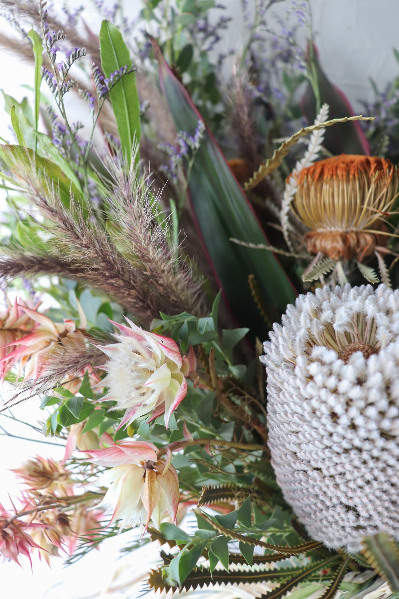 バンクシアやドライアンドラなどワイルドフラワーを使用したざっくりとナチュラルな雰囲気の花束です。